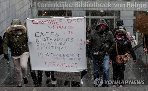 epa08941807 Protesters are blocked by police as they demonstrate against the closure of non-essential businesses in Brussels, Belgium, 16 January 2021. EPA/STEPHANIE LECOCQ