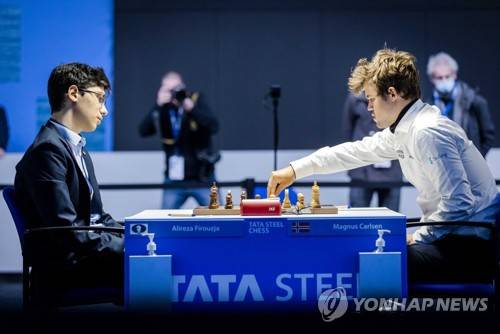 epa08941819 Chess grandmaster Magnus Carlsen (R) plays Andrey Esipenko during the first round of the international chess tournament TataSteel Chess Tournament 2021, in Wijk Aan Zee, Netherlands, 16 January 2021. Due to the corona virus pandemic, the amateur chess players are not present and there was no audience. EPA/Remko de Waal
