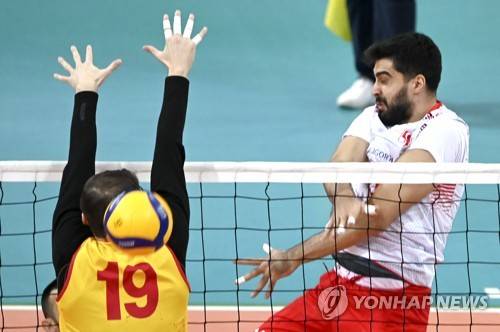 epa08942347 Samed Gunes (R) of Turkey in action against Risto Nikolov (L) of North Macedonia during the CEV EuroVolley 2021, Pool C, tournament 2, qualification volleyball match between North Macedonia and Turkey in Skopje, Republic of North Macedonia, 16 January 2021. EPA/GEORGI LICOVSKI