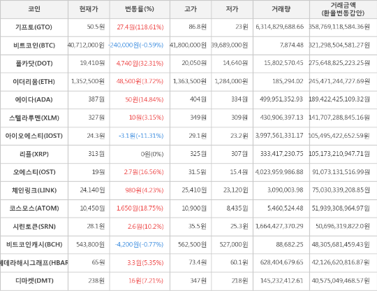 한편 거래금액 기준으로는 기프토, 비트코인, 폴카닷 순으로 가장 활발한 거래를 보이고 있다.