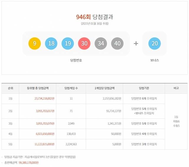 - 21억씩 받는 로또 946회 1등 11명..수동 5명
