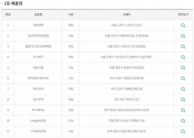 당첨번호 6개를 모두 맞힌 1등 당첨자는 11명으로 21억5766만원씩 받는다. 11명의 1등 당첨자 중 5명은 수동 방식으로, 나머지 6명은 자동 방식으로 복권을 샀다. 특히 1등 당첨자 중 5명이 서울 지역에서 나왔다.