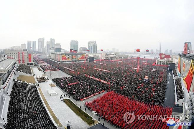 (평양 조선중앙통신=연합뉴스) 북한이 15일 평양시에서 군민연합대회를 대대적으로 열고 8차 당대회 결정 사항들을 빠짐없이 관철시키겠다는 의지를 다졌다고 17일 조선중앙통신이 보도했다. 연설·토론에 이은 군중 시위에서는 참가자들이 당대회 결정 사항 이행을 다짐하는 다양한 구호가 적힌 대형 현수막과 손팻말을 들고 행진에 나섰다. 2021.1.17