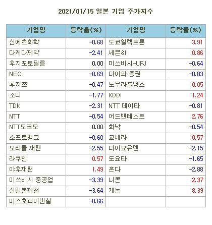 [표]일본 주요기업 주가(1/15)