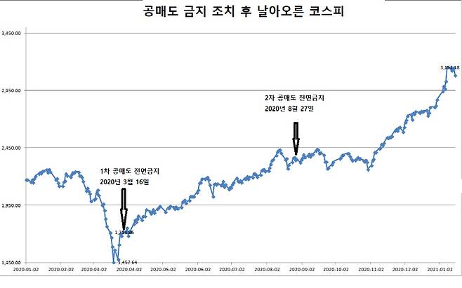 문제는 현재 코스피가 3000을 넘어서는 등 주식시장이 초호황을 누리고 있고, 그 사이에서 그동안 한번도 재미를 보지 못했다는 평가를 받는 개인투자자들이 저금리 기조에서 주식으로 수익을 내고 있다는 것, 그리고 공매도 재개 시점으로부터 약 20일 후면 4.7 서울·부산시장 재보궐선거가 있다는 점이다. 주식시장에 진입한 개인투자자들은 코스피가 작년 3월 저점을 찍었다가 수직상승하면서 그 숫자 자체가 확 늘어난 상황인데, 이들은 정치권 입장에서 보면 모두 '표'다. 특히 서울의 경우 여야 선거구도가 어떻게 될지 안갯속인 상황에서 한표가 아쉬운 여당은 또 한번의 공매도 금지 연장을 하자고 주장하고 있는 것이다. 양향자 더불어민주당 의원은 지난 11일 "오는 3월 공매도 금지가 해제된다. 개인 투자자들의 우려가 크다"면서 "공매도 금지 연장을 고민해야 한다. 늦어도 1월 중엔 답을 내려 시장 대비할 시간을 제공해야 한다"고 말하면서 공매도 연장 논의에 불을 지폈다.