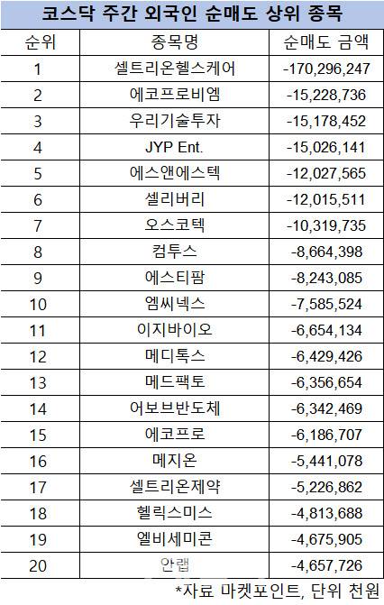 코스닥 주간 외국인 순매도 1위 '셀트리온헬스케어'