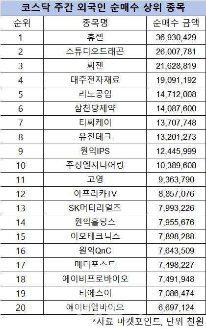 코스닥 주간 외국인 순매수 1위 '휴젤'
