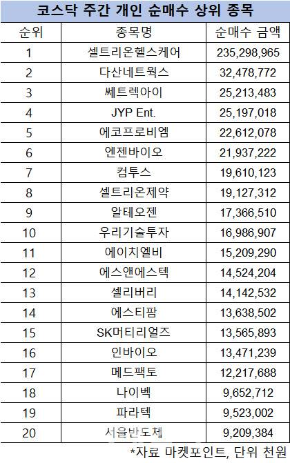 코스닥 주간 개인 순매수 1위 '셀트리온헬스케어'