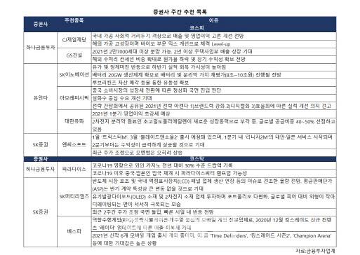 하나금융투자는 CJ제일제당(097950)을 추천했다. 코로나19로 인한 사회적 거리두기 격상으로 국내 가공 매출과 영업이익의 고른 개선이 전망되기 때문이다. 또 해외 가공도 고성장세를 보이며 바이오 부문 믹스 개선으로 체력 또한 개선되고 있다고 분석했다.