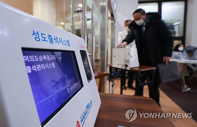 (서울=연합뉴스) 홍해인 기자 = 17일 서울 영등포구 여의도순복음교회 대성전 입구에서 비대면 예배 준비 인원 입장에 대한 방역 절차가 이뤄지고 있다.
