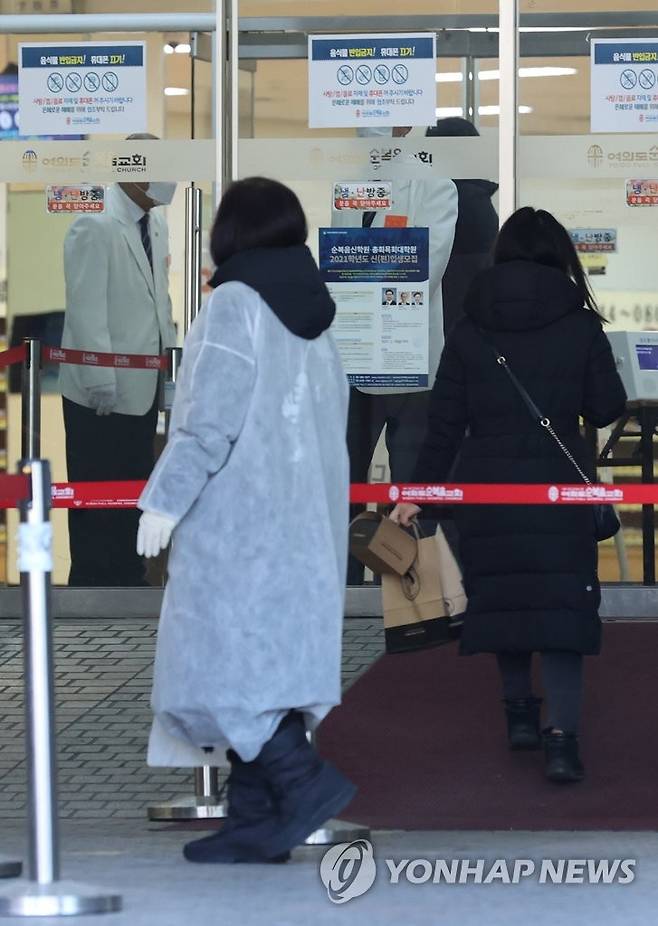 (서울=연합뉴스) 홍해인 기자 = 17일 서울 영등포구 여의도순복음교회 대성전 입구에서 비대면 예배 준비 인원 입장에 대한 방역 절차가 이뤄지고 있다.
