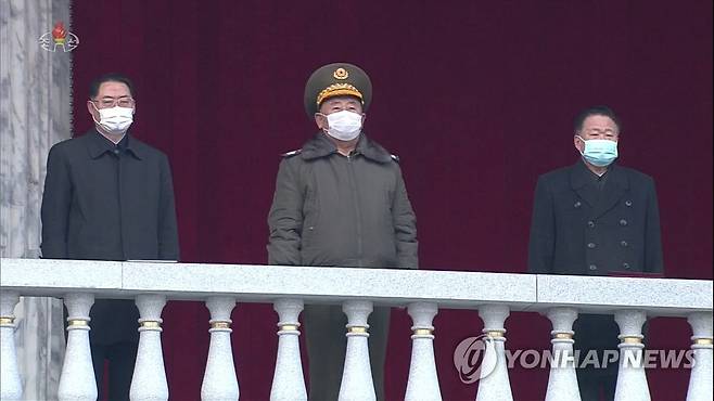 (서울=연합뉴스) 북한 주민과 군인들이 평양 김일성광장에서 8차 당대회 결정 사항 관철 의지를 다지는 군민연합대회를 열었다고 17일 조선중앙TV가 보도했다. 사진은 왼쪽부터 박태성 당 비서와 리병철 당 중앙군사위원회 부위원장, 최룡해 최고인민회의 상임위원장이 주석단에 서서 광장을 내려다보는 모습. 2021.1.17 [조선중앙TV 화면 캡처]