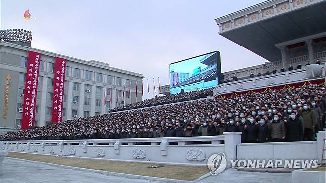 (서울=연합뉴스) 북한 주민과 군인들이 평양 김일성광장에서 8차 당대회 결정 사항 관철 의지를 다지는 군민연합대회를 열었다고 17일 조선중앙TV가 보도했다. 연설ㆍ토론에 이은 군중시위에서는 참가자들이 당대회 결정 사항 이행을 다짐하는 다양한 구호가 적힌 대형 현수막과 손팻말을 들고 행진에 나섰다. 2021.1.17 [조선중앙TV 화면 캡처]