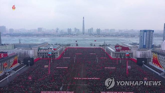 (서울=연합뉴스) 북한 주민과 군인들이 평양 김일성광장에서 8차 당대회 결정 사항 관철 의지를 다지는 군민연합대회를 열었다고 17일 조선중앙TV가 보도했다. 연설ㆍ토론에 이은 군중시위에서는 참가자들이 당대회 결정 사항 이행을 다짐하는 다양한 구호가 적힌 대형 현수막과 손팻말을 들고 행진에 나섰다. 2021.1.17 [조선중앙TV 화면 캡처]