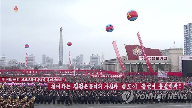 (서울=연합뉴스) 북한 주민과 군인들이 평양 김일성광장에서 8차 당대회 결정 사항 관철 의지를 다지는 군민연합대회를 열었다고 17일 조선중앙TV가 보도했다. 연설ㆍ토론에 이은 군중시위에서는 참가자들이 당대회 결정 사항 이행을 다짐하는 다양한 구호가 적힌 대형 현수막과 손팻말을 들고 행진에 나섰다. 2021.1.17 [조선중앙TV 화면 캡처]