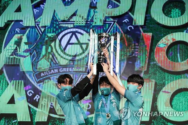 (서울=연합뉴스) 지난 16일 아프리카TV 프릭업스튜디오에서 열린 eK리그 결승전에서 안산 그리너스 FC가 초대 챔피언에 등극했다고 한국프로축구연맹이 17일 밝혔다.