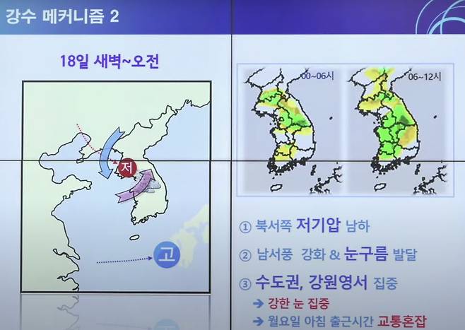 18일 새벽부터 오전 사이엔 북쪽의 저기압이 북한 옹진반도 주변까지 내려오면서 구름대를 더 발달 시켜 전면 따뜻한 공기 강화되면서 눈구름대 강화될 것으로 기상청은 전망했다.