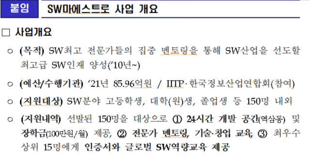 'SW마에스트로'는 SW분야 최고 전문가들의 집중 멘토링과 심화학습을 통해 기술역량과 창의력을 갖춘 최고급 소프트웨어 인재를 양성하는 과정이다. 2010년에 시작했고, 지난해까지 매출액 100억원 이상 기업 4곳을 포함해 수료생들이 110개 스타트업을 설립했다.