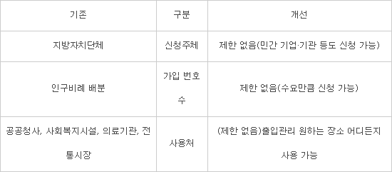 또, 종전 공공청사와 사회복지시설 등으로 사용을 제한했지만, 출입관리를 원하는 장소 어디든지 사용 가능하도록 했다.