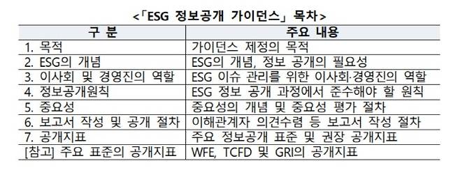 가이던스는 정보공개의 필요성, 보고서 작성과 공개 절차, 그 과정에서 준수해야 할 원칙과 ESG 정보공개와 관련한 글로벌 표준 등으로 구성됐다. 특히 상장법인에 실질적인 도움이 될 수 있도록 주요 항목에 대한 우수 실행력과 공개 대상 정보 선택에 참고 가능한 권고공개지표(12개 항목 21개 지표)를 포함하고 있다.
