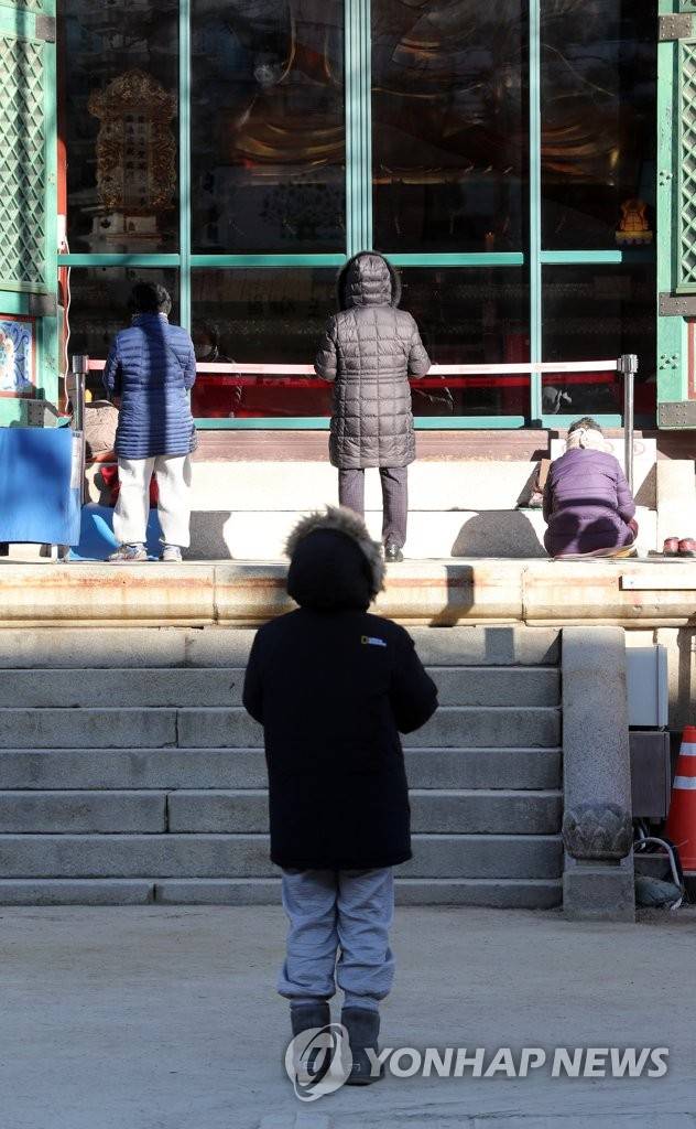 서울 최저기온이 영하 10도까지 내려가고 낮 기온도 영하에 머무른 17일 종로구 조계사 대웅전 밖에서 신도들이 사회적 거리를 두고 기도를 하고 있다.