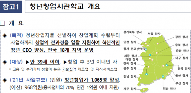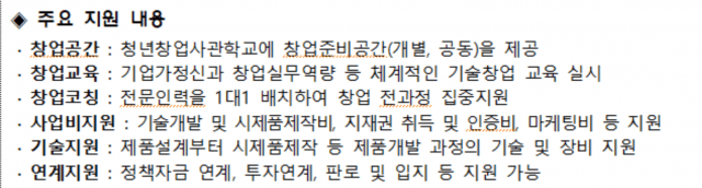 청년창업사관학교는 유망 창업아이템과 혁신기술을 보유한 우수 창업자를 발굴해 창업 전 단계를 패키지로 지원하는 사업이다.