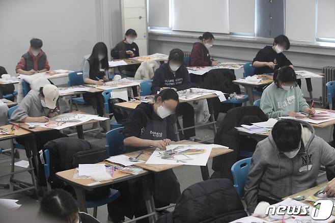 (서울=뉴스1) 안은나 기자 = 17일 서울 성북구 국민대학교에서 수험생들이 2021학년도 정시모집 조형대학 실기고사를 치르고 있다. 2021.1.17/뉴스1
