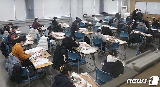 (서울=뉴스1) 안은나 기자 = 17일 서울 성북구 국민대학교에서 수험생들이 2021학년도 정시모집 조형대학 실기고사를 치르고 있다. 2021.1.17/뉴스1