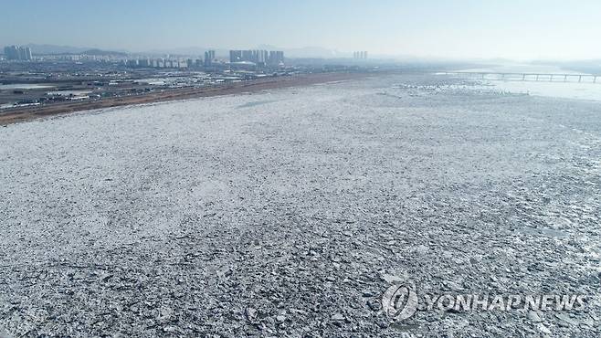(김포=연합뉴스) 김도훈 기자 = 서울 아침 기온이 영하 10도를 기록한 17일 오전 경기도 고양시와 김포시 사이 한강이 유빙으로 뒤덮여 있다. 2021.1.17