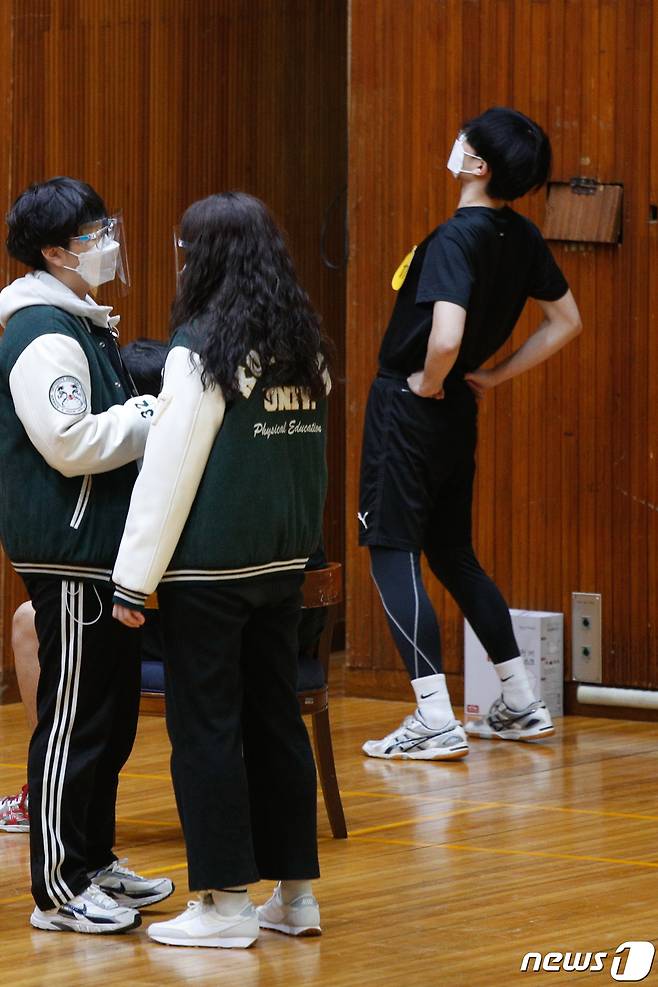 (서울=뉴스1) 안은나 기자 = 17일 서울 성북구 국민대학교에서 열린 2021학년도 체육대학 스포츠교육학과 정시 실기고사에서 수험생이 왕복달리 전 몸을 풀고 있다. 2021.1.17/뉴스1