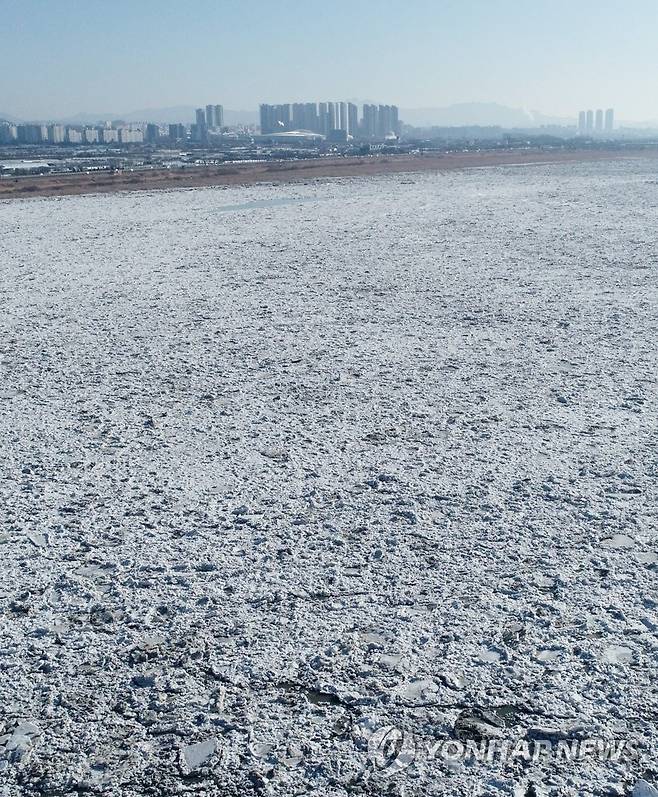 (김포=연합뉴스) 김도훈 기자 = 서울 아침 기온이 영하 10도를 기록한 17일 오전 경기도 고양시와 김포시 사이 한강이 유빙으로 뒤덮여 있다. 2021.1.17