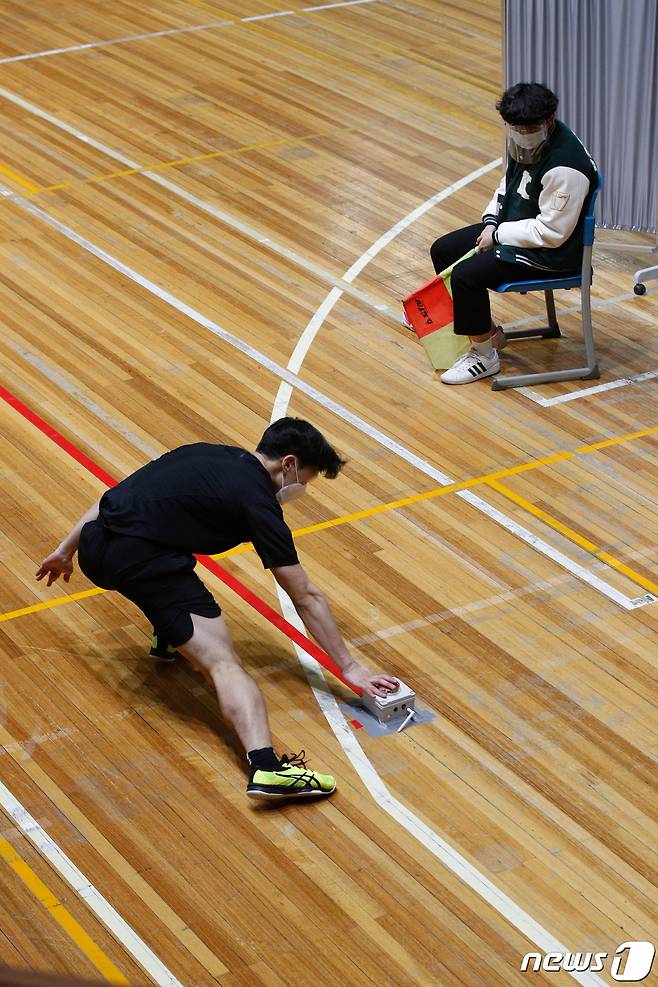 (서울=뉴스1) 안은나 기자 = 17일 서울 성북구 국민대학교에서 열린 2021학년도 체육대학 스포츠교육학과 정시 실기고사에서 수험생이 왕복달리기를 하고 있다. 2021.1.17/뉴스1