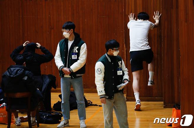 (서울=뉴스1) 안은나 기자 = 17일 서울 성북구 국민대학교에서 열린 2021학년도 체육대학 스포츠교육학과 정시 실기고사에서 수험생이 왕복달리기 전 몸을 풀고 있다. 2021.1.17/뉴스1