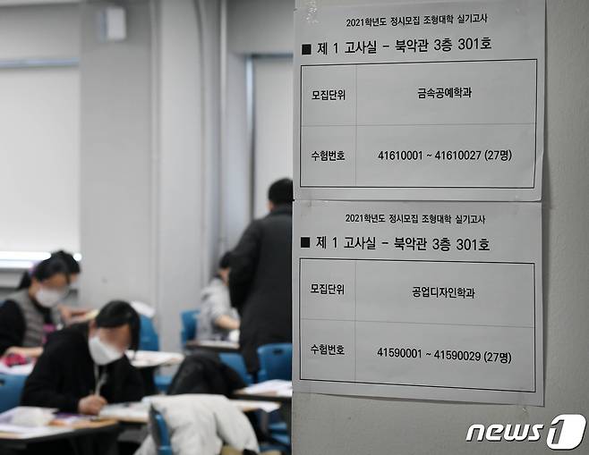 (서울=뉴스1) 안은나 기자 = 17일 서울 성북구 국민대학교에서 수험생들이 2021학년도 정시모집 조형대학 실기고사를 치르고 있다. 국민대는 신종 코로나바이러스 감염증(코로나19) 예방을 위해 각 고사장 별로 최대 수용 인원의 4분의 1 수준인 27명으로 제한하고 자리를 재배치했다. 2021.1.17/뉴스1