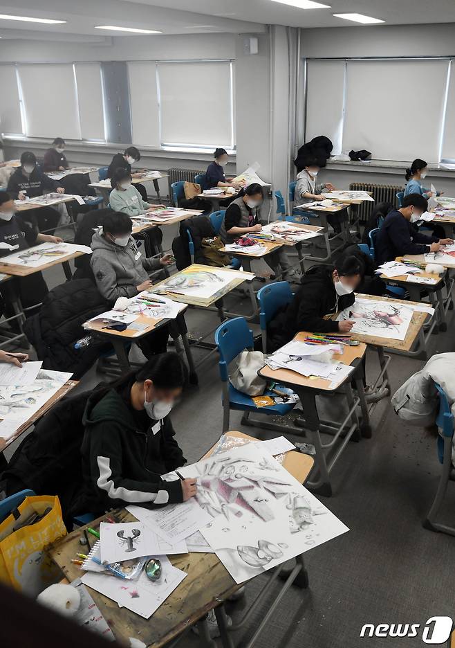 (서울=뉴스1) 안은나 기자 = 17일 서울 성북구 국민대학교에서 수험생들이 2021학년도 정시모집 조형대학 실기고사를 치르고 있다. 국민대는 신종 코로나바이러스 감염증(코로나19) 예방을 위해 각 고사장 별로 최대 수용 인원의 4분의 1 수준인 27명으로 제한하고 자리를 재배치했다. 2021.1.17/뉴스1