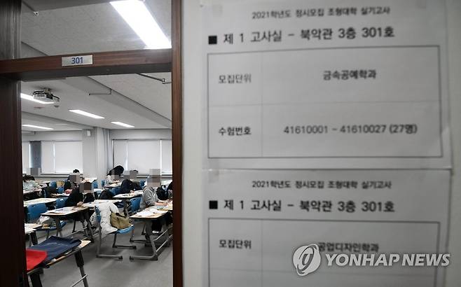 (서울=연합뉴스) 홍해인 기자 = 17일 서울 성북구 국민대학교에서 마스크를 쓴 수험생들이 2021학년도 대입 정시모집 조형대학 실기고사를 치르고 있다. 2021.1.17