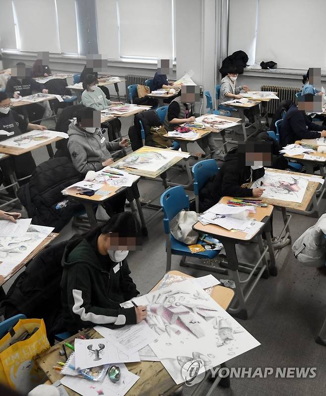 (서울=연합뉴스) 홍해인 기자 = 17일 서울 성북구 국민대학교에서 마스크를 쓴 수험생들이 2021학년도 대입 정시모집 조형대학 실기고사를 치르고 있다. 2021.1.17