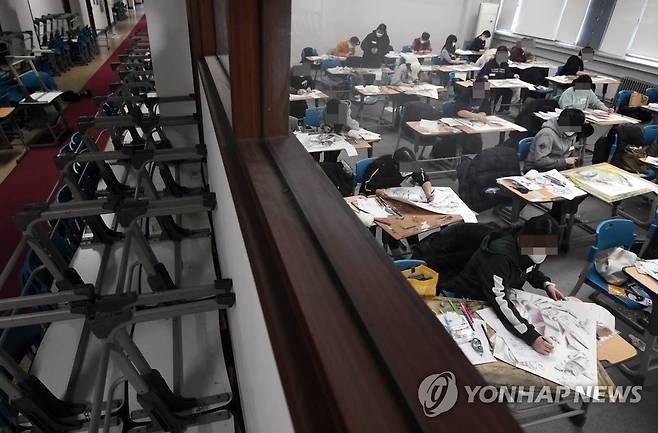 (서울=연합뉴스) 홍해인 기자 = 17일 서울 성북구 국민대학교에서 마스크를 쓴 수험생들이 2021학년도 대입 정시모집 조형대학 실기고사를 치르고 있다. 2021.1.17