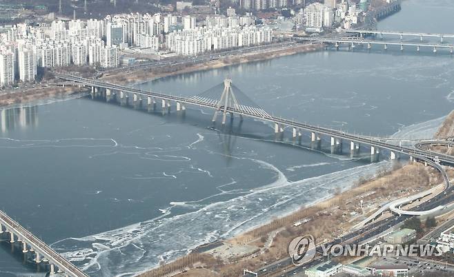 (서울=연합뉴스) 이재희 기자 = 서울 낮기온이 영하권에 머문 17일 서울 올림픽대교 인근 한강에 얼음이 얼어 있다. 2021.1.17