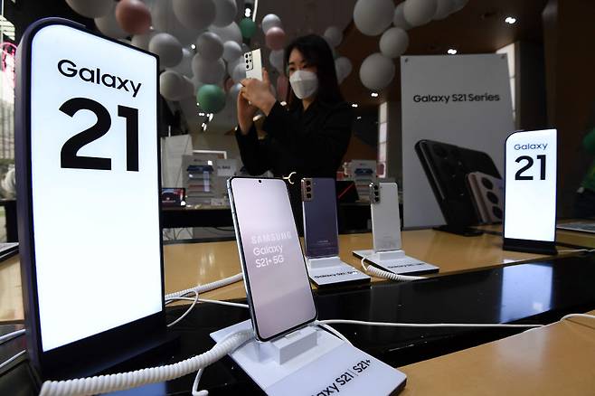지난 15일 온라인을 통해 먼저 공개했던 삼성전자 갤럭시S21 시리즈가 오프라인 매장에도 선을 보였다. 주말 서울 종로구 KT스퀘어에서 고객이 갤럭시S21을 체험하고 있다. 갤럭시S21 시리즈는 29일 공식 출시된다.