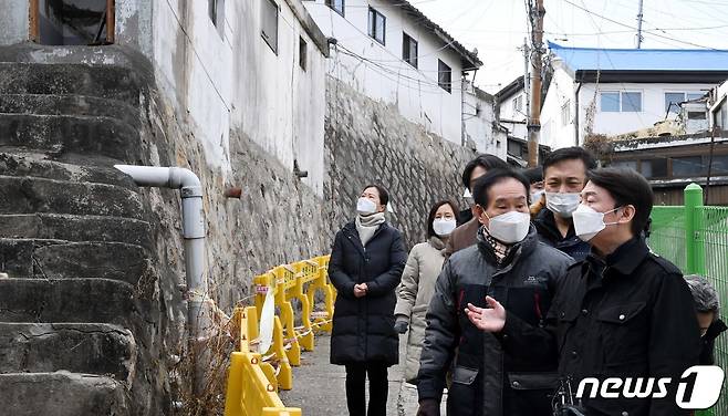 (서울=뉴스1) 국회사진취재단 = 안철수 국민의당 대표가 17일 오후 서울 종로구 사직2구역 재개발지역을 방문해 조합 관계자들에게 애로사항을 듣고 있다. 2021.1.17/뉴스1
