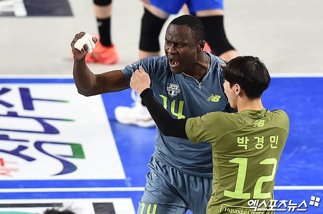 [엑스포츠뉴스 천안, 박지영 기자] 17일 오후 충청남도 천안종합운동장 유관순체육관에서 열린 '2020-2021 도드람 V리그' 남자부 현대캐피탈과 한국전력의 경기, 현대캐피탈 다우디가 득점 후 환호하고 있다.