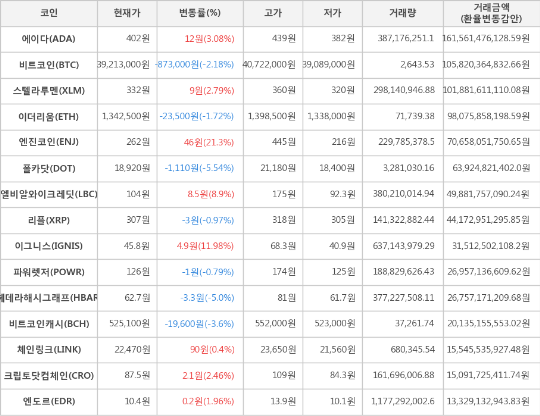 한편 거래금액 기준으로는 에이다, 비트코인, 스텔라루멘 순으로 가장 활발한 거래를 보이고 있다.