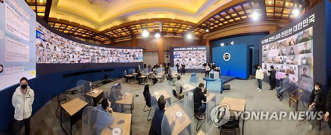 (서울=연합뉴스) 최재구 기자 = 문재인 대통령 신년 기자회견을 하루 앞둔 17일 청와대 춘추관 기자회견장에서 탁현민 의전비서관 등 청와대 관계자들과 출입기자들이 리허설을 하고 있다. 사진 왼쪽에 온라인 채팅창이 보인다. 2021.1.17