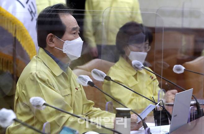 [이데일리 방인권 기자] 정세균 국무총리가 17일 오후 서울 종로구 정부서울청사에서 열린 '신종 코로나바이러스 감염증(코로나19) 대응 중앙재난안전대책본부 회의'를 주재하고 있다.