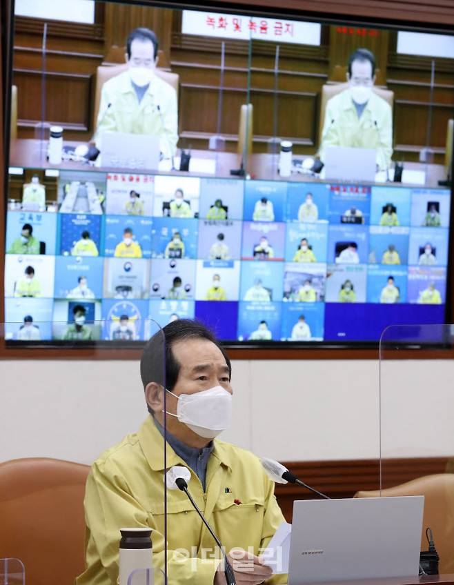 [이데일리 방인권 기자] 정세균 국무총리가 17일 오후 서울 종로구 정부서울청사에서 열린 '신종 코로나바이러스 감염증(코로나19) 대응 중앙재난안전대책본부 회의'를 주재하고 있다.