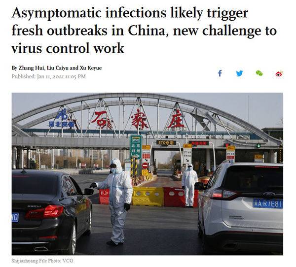 앞서 중국 관영 글로벌타임스도 무증상 감염자의 위험성을 보도했습니다. 글로벌타임스는 1월 11일자 기사에서 "무증상 감염이 중국에서 새로운 확산을 촉발할 수 있으며 코로나19 통제의 새로운 위협으로 부상하고 있다"고 했습니다.