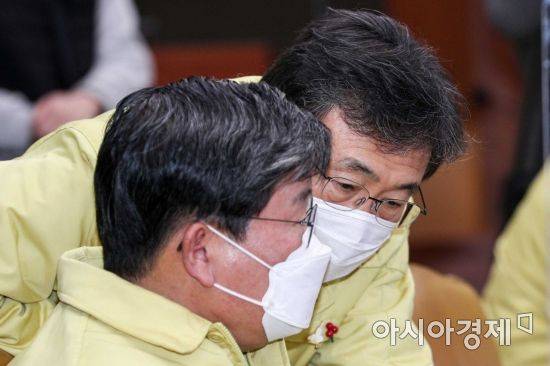 권덕철 보건복지부 장관과 전해철 행정안전부 장관이 17일 서울 종로구 정부서울청사에서 열린 '신종 코로나바이러스감염증(코로나19) 대응 중대본회의'에 참석해 의견을 나누고 있다./강진형 기자aymsdream@