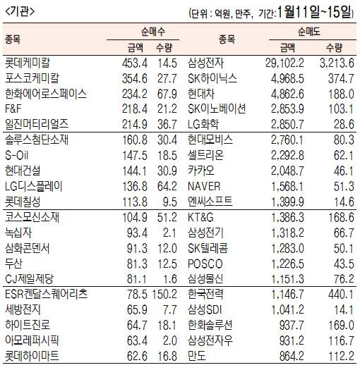 [표]주간 유가증권 기관·외국인·개인 순매수·도 상위종목(1월 11일~15일)