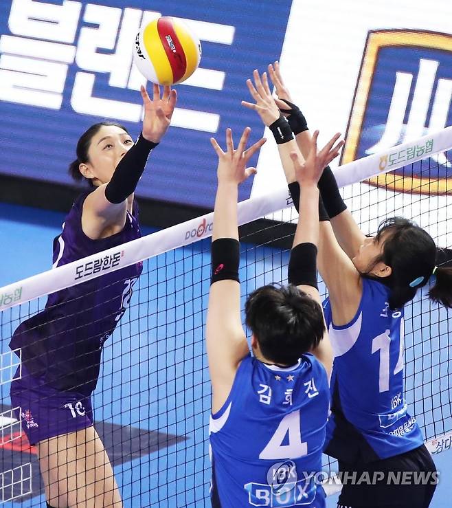(화성=연합뉴스) 홍기원 기자 = 17일 경기도 화성종합경기타운 실내체육관에서 열린 프로배구 V리그 여자부 IBK기업은행 알토스와 과 흥국생명 핑크스파이더스의 경기. 흥국생명 김연경이 공격하고 있다. 2021.1.17
